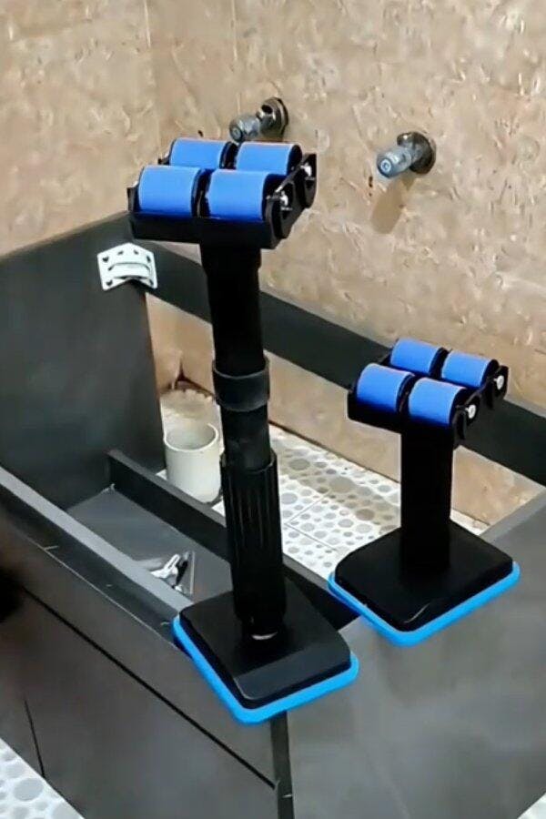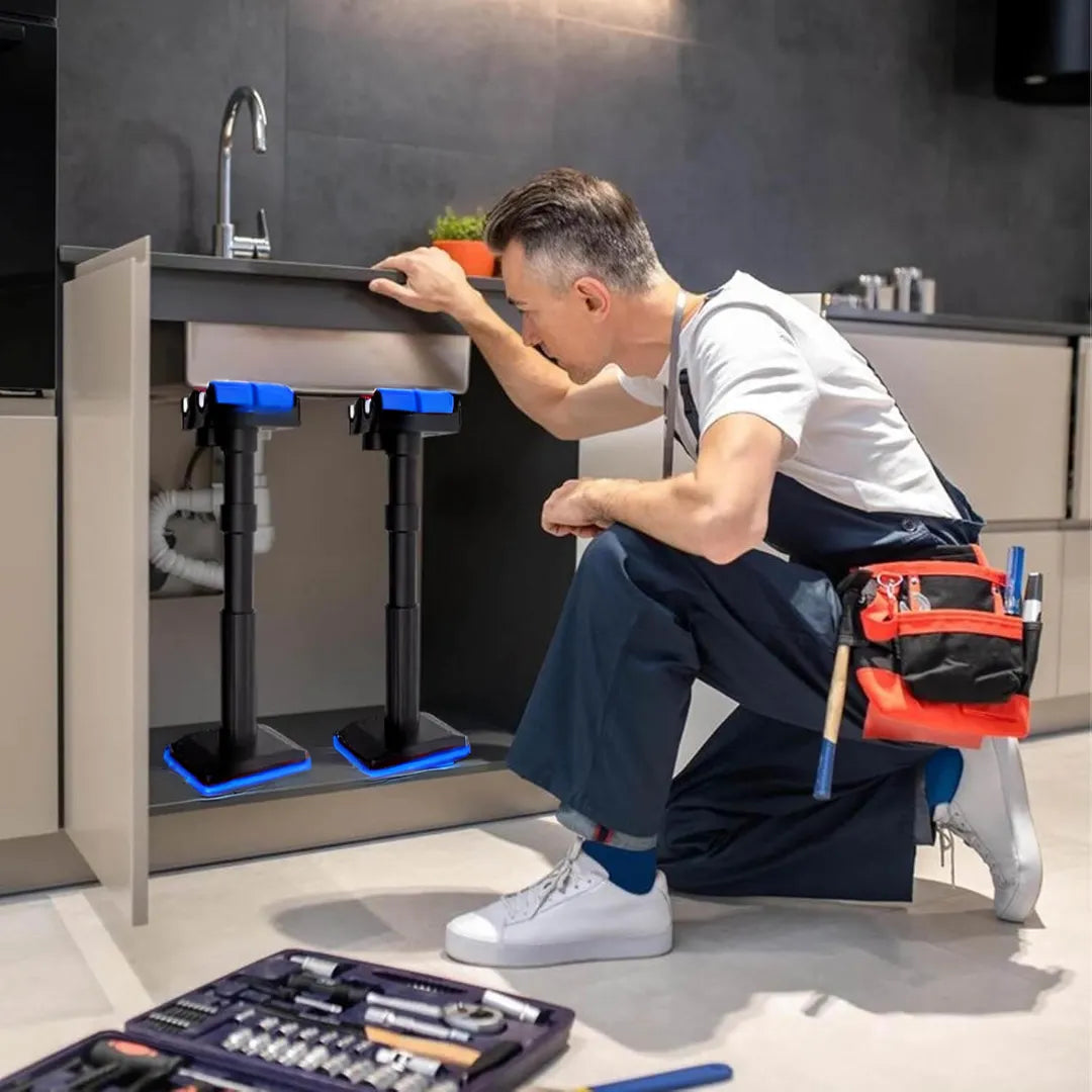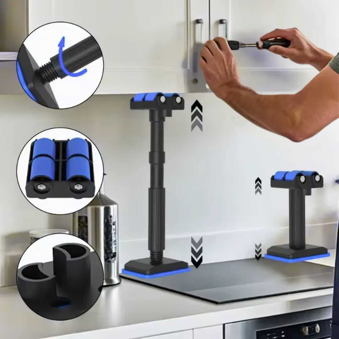 Capacidad de hasta 200 kg con tubos de acero engrosado. Ajuste fino por barras de extensión + tornillo: fija la altura exacta y mantén la pieza estable mientras instalas.AGARRE ANTIDESLIZANTE, SIN DAÑOS