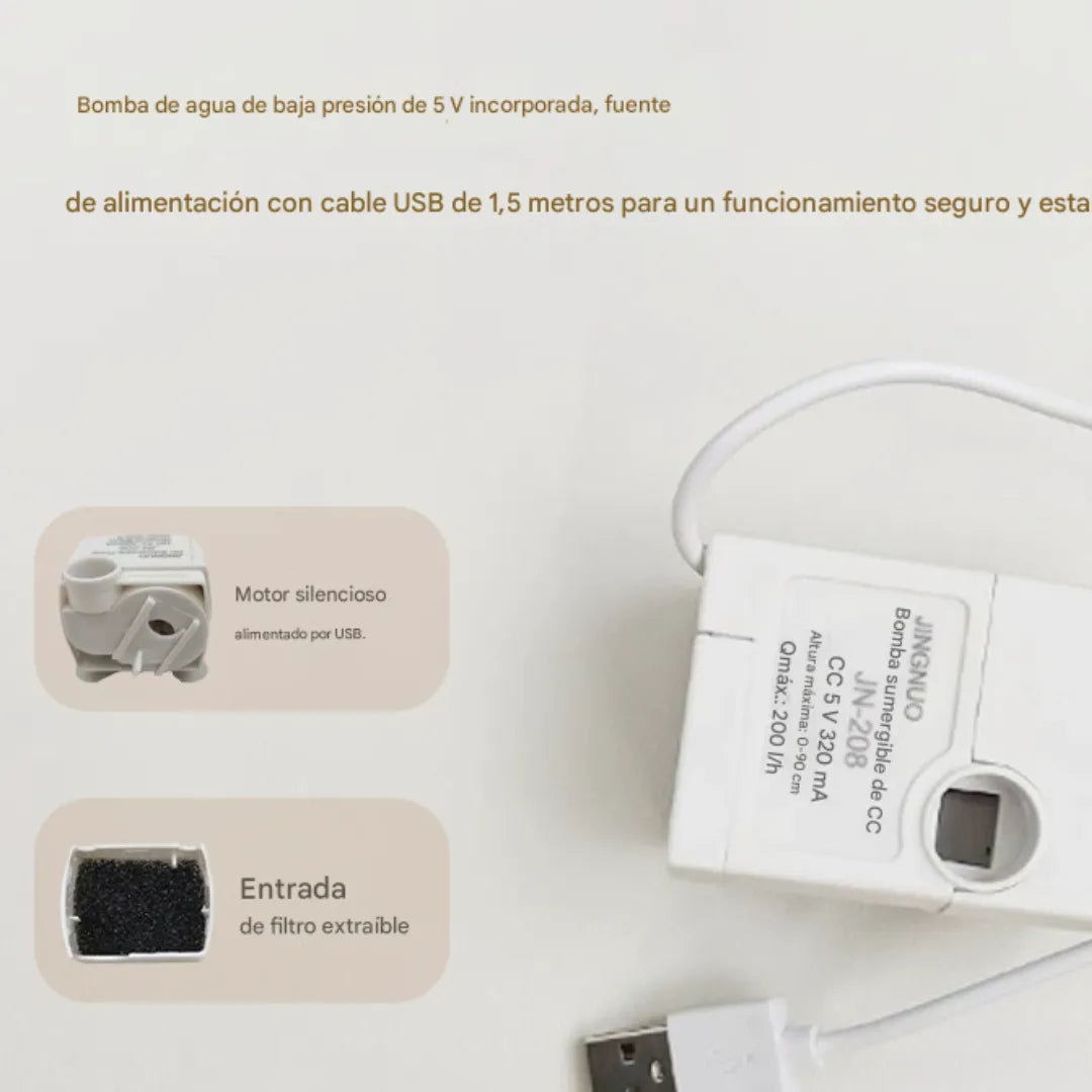Funciona mediante conexión USB, asegurando un flujo constante y estable de agua.