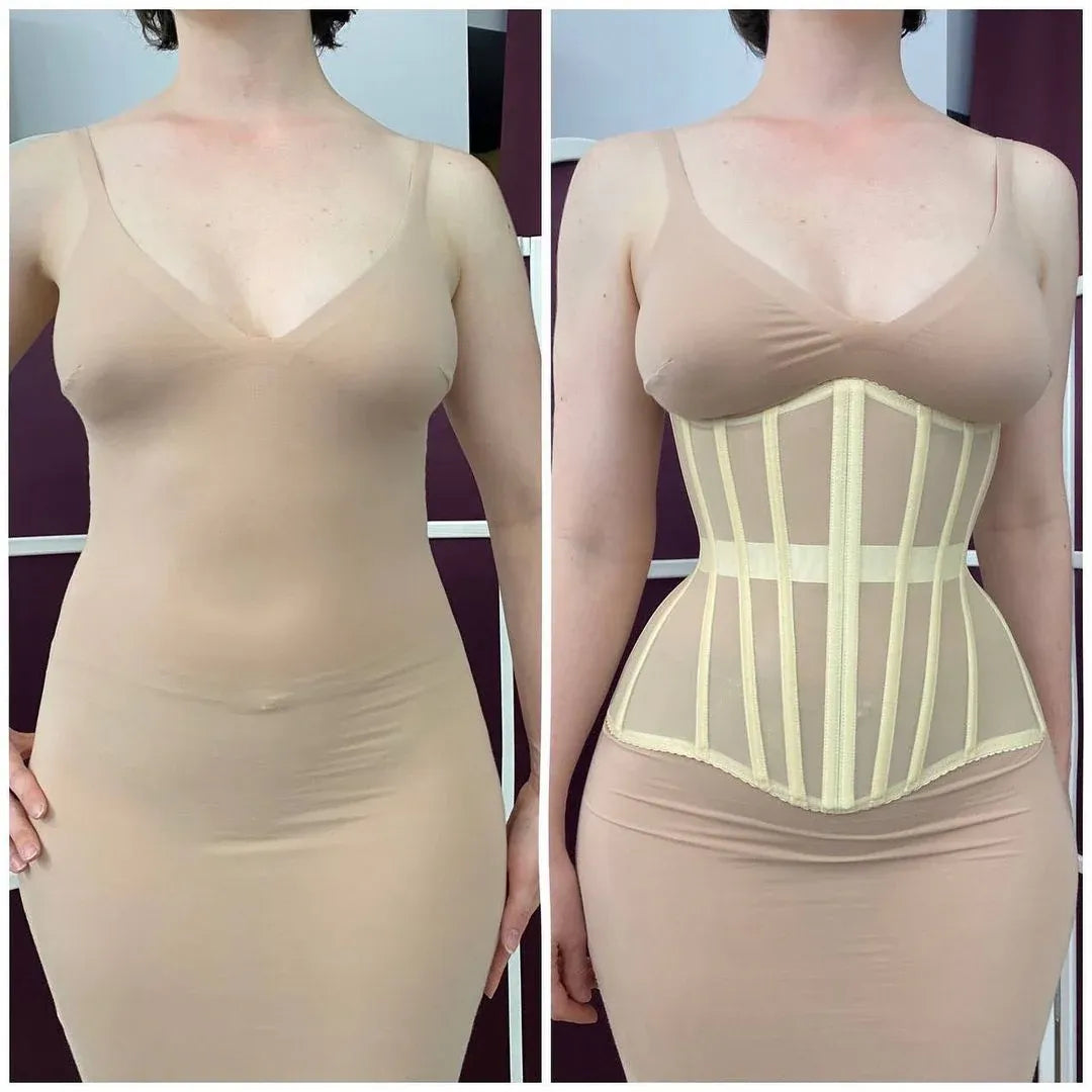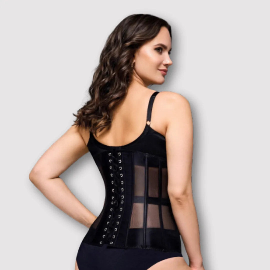 Es un corsé moldeador femenino de estructura firme y diseño estilizado, creado para definir la cintura y crear una silueta tipo reloj de arena de forma instantánea.