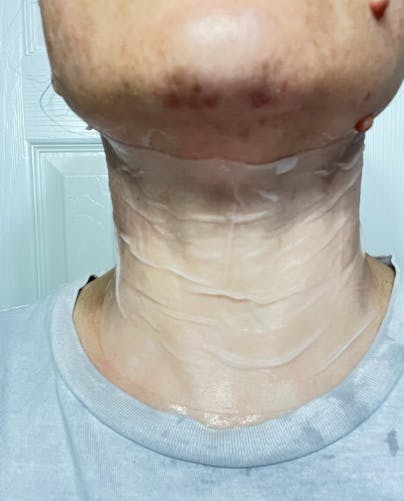 Recibes tu mascarilla de cuello con colágeno y leche, lista para usar y ayudarte a mejorar la apariencia y salud de la piel del cuello desde la primera aplicación.