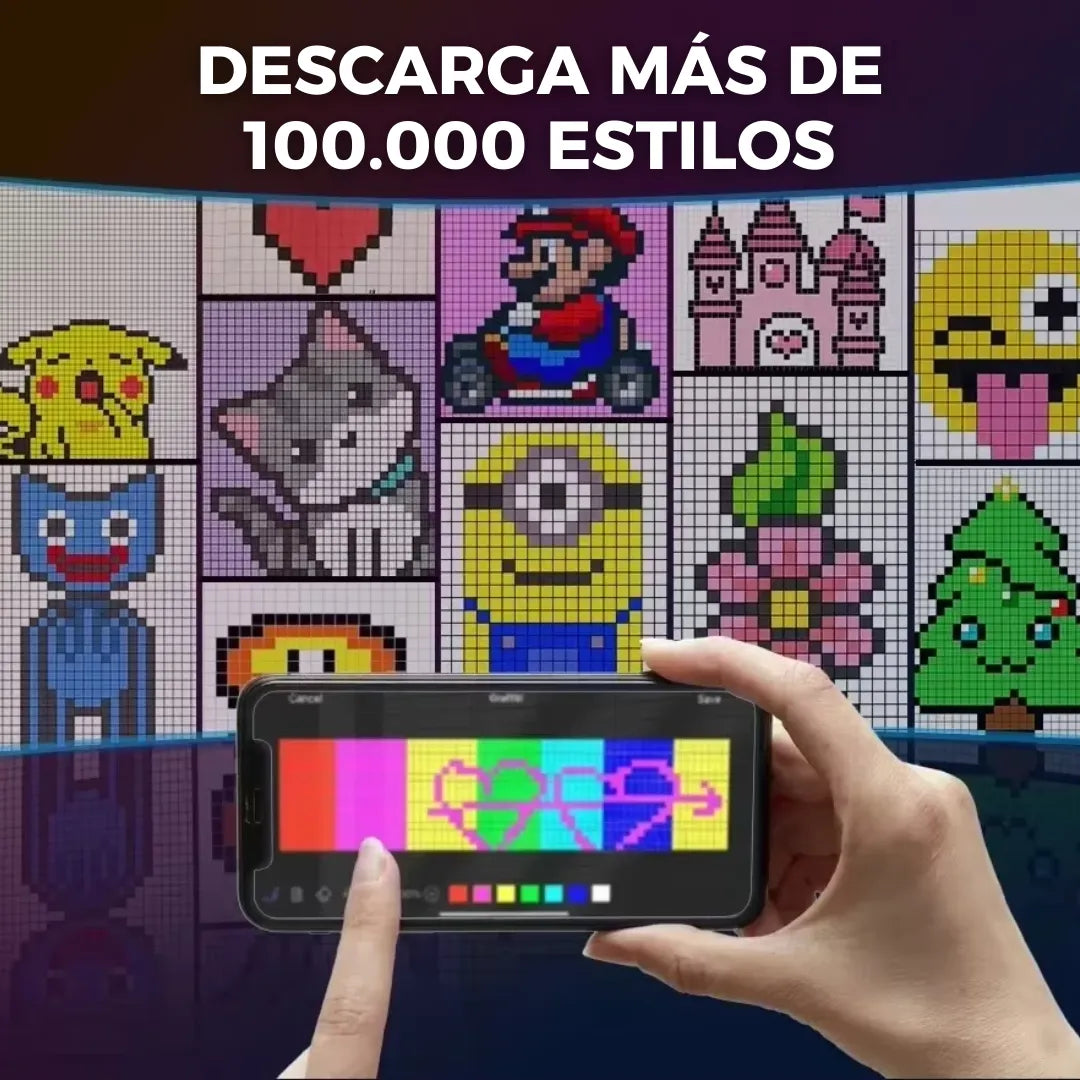 Descarga la app, conecta y cambia diseños, ojos y animaciones cuando quieras. Edita texto, sube tus creaciones y actualiza en segundos desde el celular.